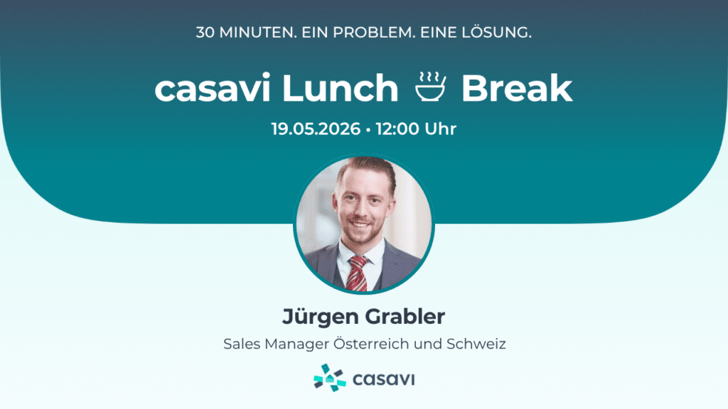 Die monatliche Webinarreihe für Immobilienverwalter mit wenig Zeit – und vielen Herausforderungen. Einmal im Monat um 12:00 Uhr nehmen wir uns eine konkrete Herausforderung aus dem Verwaltungsalltag vor und zeigen live, wie casavi es mit einer smarten Funktion löst.