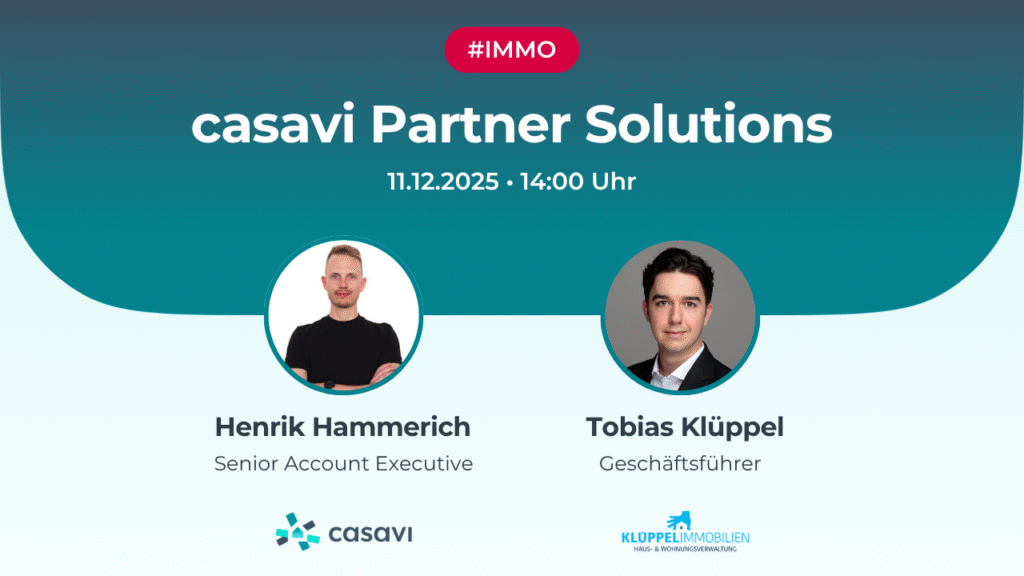 Unsere Referenten Henrik Hammerich (Senior Account Executive bei casavi) und Tobias Klüppel (Geschäftsführer bei Klüppel Immobilien) geben Ihnen exklusive Einblicke und beantworten Ihre Fragen.